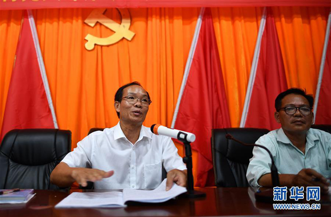 2017年9月28日晚,羊風(fēng)極(左)在海南省白沙黎族自治縣打安鎮(zhèn)田表村村委會(huì)組織黨員進(jìn)行“兩學(xué)一做”學(xué)習(xí)教育活動(dòng)