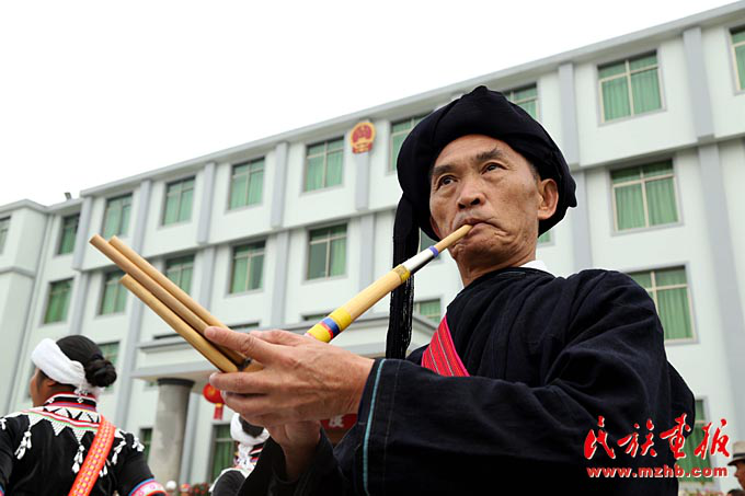 拉祜族群眾在縣政府大樓前歡歌跳舞(瀾滄縣民宗局供圖)