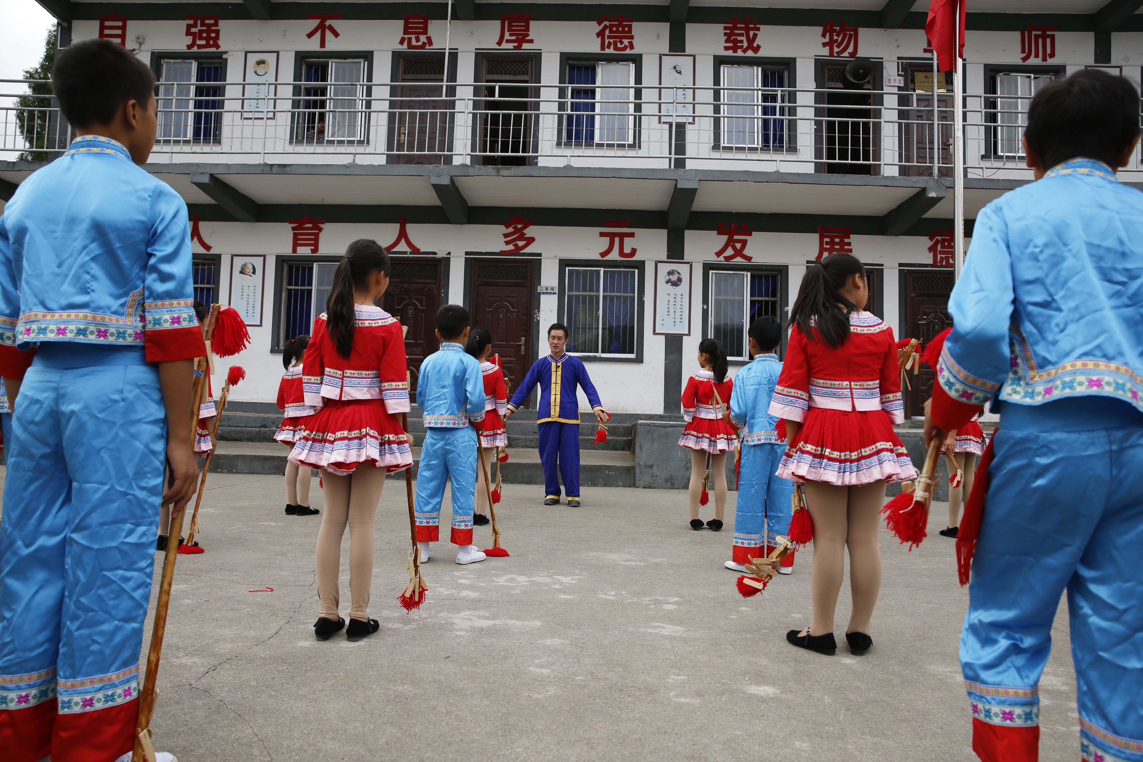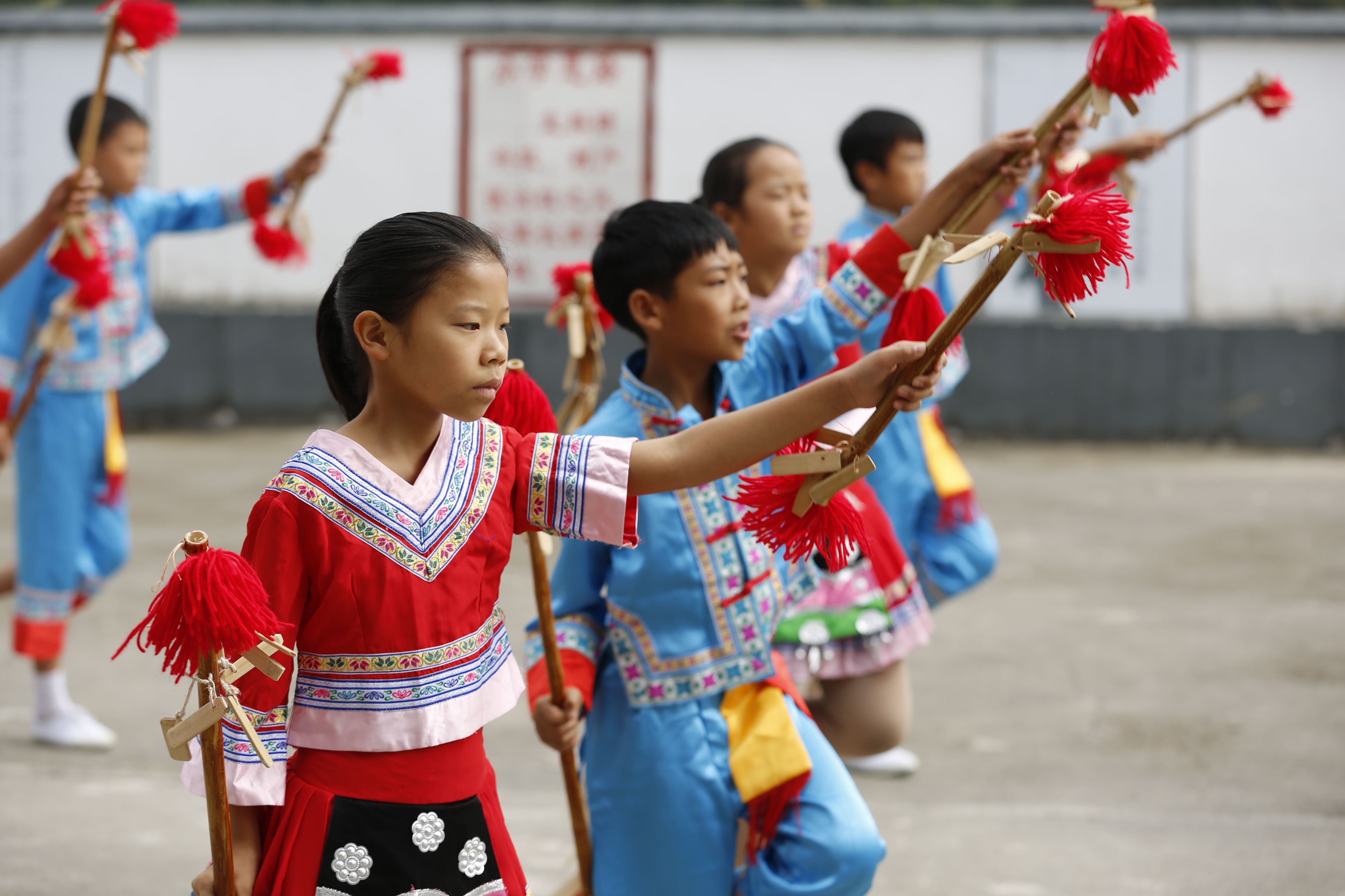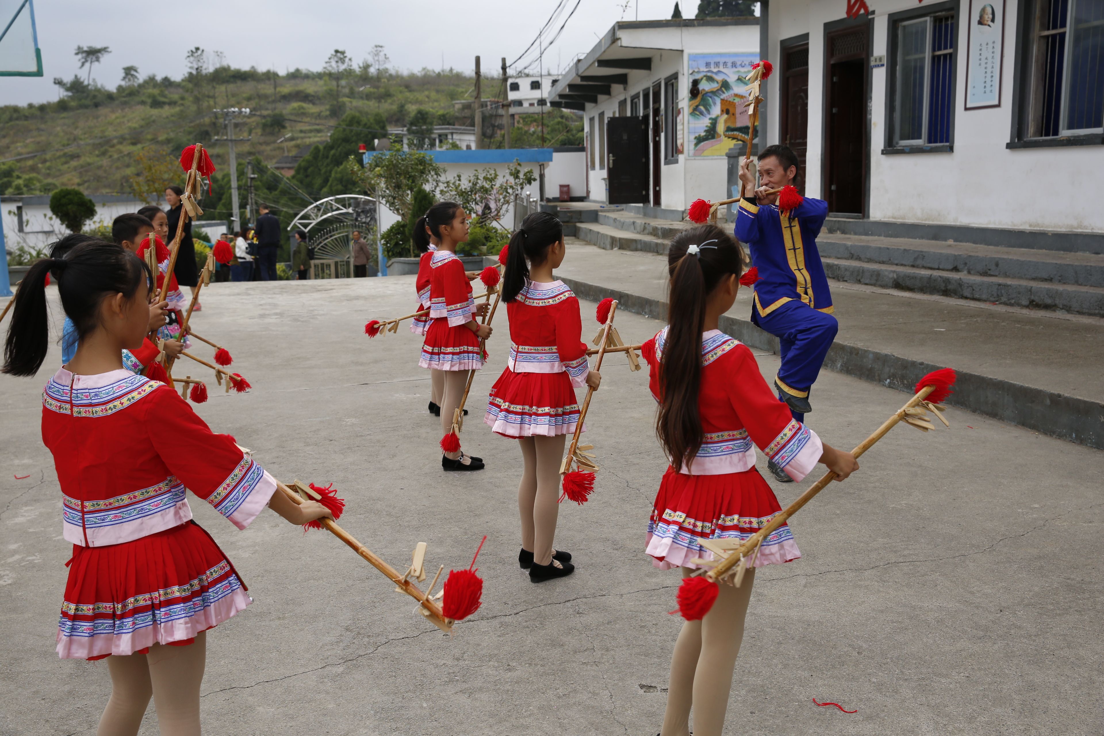 圖片說明:貴州貴陽苗族長竹舞傳承人教孩子們跳長竹舞