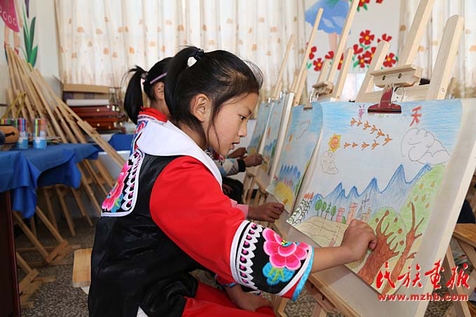 走進臘灣民族小學,濃郁的彝族文化撲面而來。在學校的操場上,學生們的課間操跳的是瑪咕舞。瑪咕舞起源于牟定縣鳳屯鎮(zhèn)臘灣村,被譽為彝族文化的活化石,彝語意為老年人跳的左腳舞,習慣上稱為“老人舞”。臘灣民族小學根據(jù)瑪咕舞特點,編排出了瑪咕舞課間操。在彝族傳統(tǒng)民歌音樂背景下,孩子們圍成圈,步伐緩慢而優(yōu)雅。臘灣民族小學校長李發(fā)庭告訴記者:“臘灣瑪咕舞有約定成俗的規(guī)定:三胡聲不停止,四弦琴不彈奏,老人舞不上場,年輕人不能跳腳。長者在傳承弘揚彝族傳統(tǒng)文化的同時,我們還要將祖先尊老敬老的優(yōu)秀品質(zhì)告訴孩子們?!?/p>