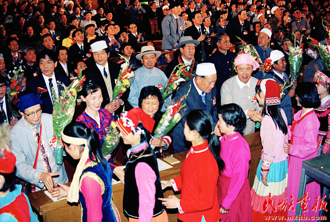 1988年4月25日至29日,首次全國民族團(tuán)結(jié)進(jìn)步表彰大會(huì)在北京舉行,圖為大會(huì)現(xiàn)場.《民族畫報(bào)》1988年第8期