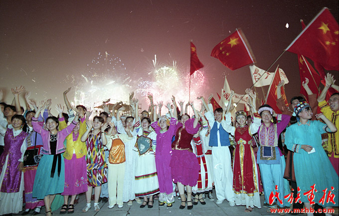 1997年7月1日零點(diǎn),中華人民共和國國旗和香港特別行政區(qū)區(qū)旗在香港升起,經(jīng)歷了百年滄桑的香港回到祖國的懷抱,中國政府開始對(duì)香港恢復(fù)行使主權(quán)。香港回歸祖國,舉國上下一片歡騰。各族人民以隆重而熱烈的方式,歡呼五星紅旗在香港特別行政區(qū)高高飄揚(yáng)。圖為首都各民族學(xué)生熱烈慶祝香港回歸?!睹褡瀹媹?bào)》1997年第9期
