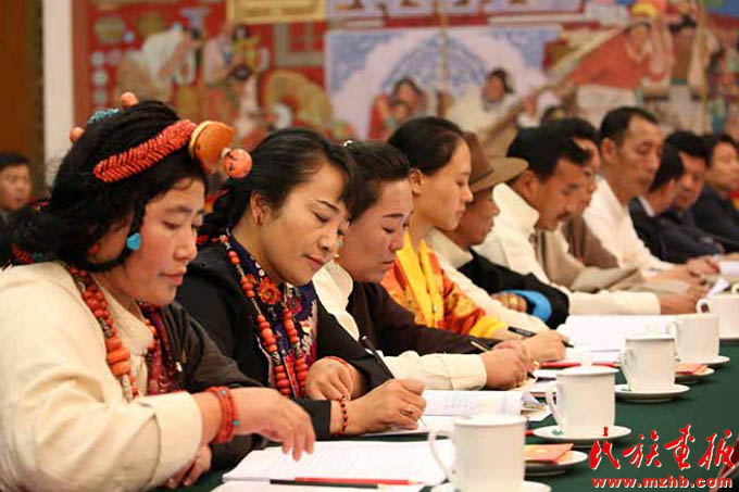 2017年10月18日,在中國共產(chǎn)黨第十九次全國代表大會(huì)上,習(xí)近平鄭重宣示:“經(jīng)過長期努力,中國特色社會(huì)主義進(jìn)入了新時(shí)代,這是我國發(fā)展新的歷史方位?!笔糯髨?bào)告中,習(xí)近平用五句話深刻揭示了新時(shí)代的內(nèi)涵,指出這個(gè)新時(shí)代,是承前啟后、繼往開來、在新的歷史條件下繼續(xù)奪取中國特色社會(huì)主義偉大勝利的時(shí)代,是決勝全面建成小康社會(huì)、進(jìn)而全面建設(shè)社會(huì)主義現(xiàn)代化強(qiáng)國的時(shí)代,是全國各族人民團(tuán)結(jié)奮斗、不斷創(chuàng)造美好生活、逐步實(shí)現(xiàn)全體人民共同富裕的時(shí)代,是全體中華兒女勠力同心、奮力實(shí)現(xiàn)中華民族偉大復(fù)興中國夢(mèng)的時(shí)代,是我國日益走近世界舞臺(tái)中央、不斷為人類作出更大貢獻(xiàn)的時(shí)代。圖為席黨的十九大的西藏自治區(qū)代表團(tuán)代表在討論十九大報(bào)告?!睹褡瀹媹?bào)》2017年第11期
