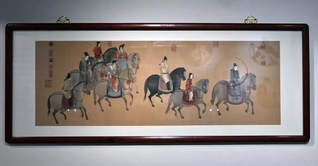 取材于唐代畫家張萱的畫作《虢國夫人游春圖》和《簪花仕女圖》,作品采用橫織豎裱的方式呈現(xiàn)。