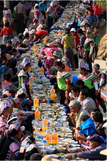 節(jié)日期間,哈尼寨子擺起長街宴,哈尼語叫“姿八多”,意為“互相輪流著敬酒”。小寨子擺一次,吃一天,大寨子則要擺兩三次,吃兩三天。每戶做一桌酒菜,抬到寨子街道上擺好,一戶接一戶沿著街道擺成長街宴,八個或十個人自愿結合為一桌暢飲。大寨子分片輪流做東,負責長街宴的酒菜,其他片的人做食客,從早吃到晚,場面十分熱鬧。