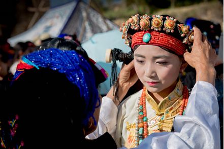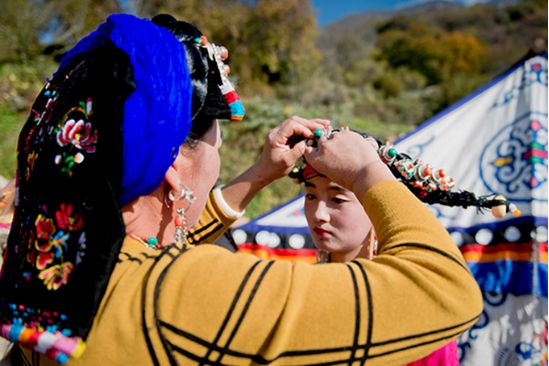 盤好發(fā)髻,佩戴好頭飾,在肩、背系好五彩哈達后,由本村具有威望的女性長者引領(lǐng)來到儀式現(xiàn)場。法號聲中,煨桑的青煙裊裊升起,威嚴的活佛主持誦經(jīng)祈福儀式。隨后,德高望重的長者為參加儀式的女子送祝福茶,長輩為姑娘們獻哈達。一系列儀式結(jié)束后,無論男女老少,都來到場地中央,踏歌起舞,跳起吉祥的鍋莊。