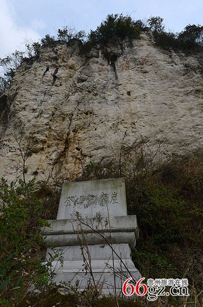 金山洞摩崖是貴陽市花溪區(qū)最早的摩崖石刻,也是貴州最早的摩崖石刻之一。該摩崖石刻位于燕樓鄉(xiāng)東北三里的金山洞巖壁上。其山上豐下儉,古人利用自然山形,在可避風雨的洞壁上摩巖、題刻賦詩作畫。整個摩崖面積通高140厘米,寬74厘米;自右至左豎行排列,共6行82字。據(jù)系楷書陰刻,書法古樸流暢,具有較高的歷史價值。