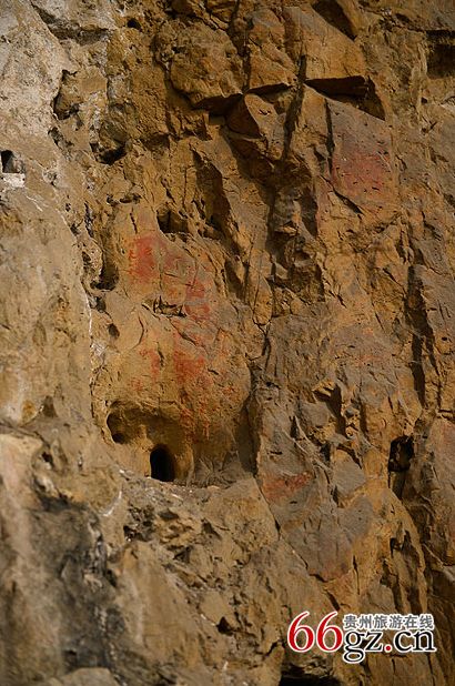 據(jù)資料載,金山洞古代崖畫以赭色涂繪人、馬、狗等等,隱約可見形態(tài)各異的大小圖像二三十個。人物多作行走狀,亦有雙手高舉者,似乎在祈禱。從其畫風觀察,與相距不遠的省級文物保護單位--長順龍家院崖畫十分相似。