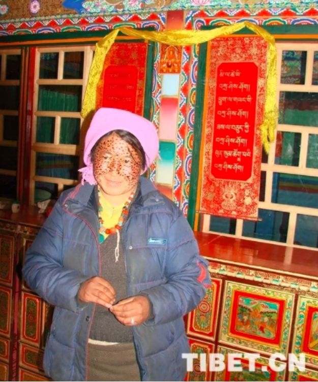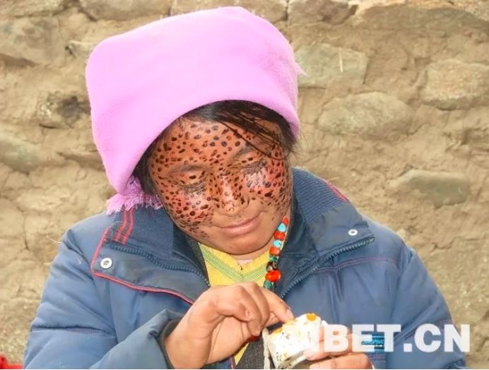 一般情況下,藏北牧區(qū)婦女外出勞作都會用圍巾將頭部和頸部圍住,這樣既可以保暖御寒又可以抵御強烈的紫外線。而“安達”可用于涂抹除了眼睛、嘴巴、鼻子外所有臉部區(qū)域。涂抹在臉上的“安達”自然干了后,婦女們往往會等到第二天甚至第三天再用溫水洗凈。