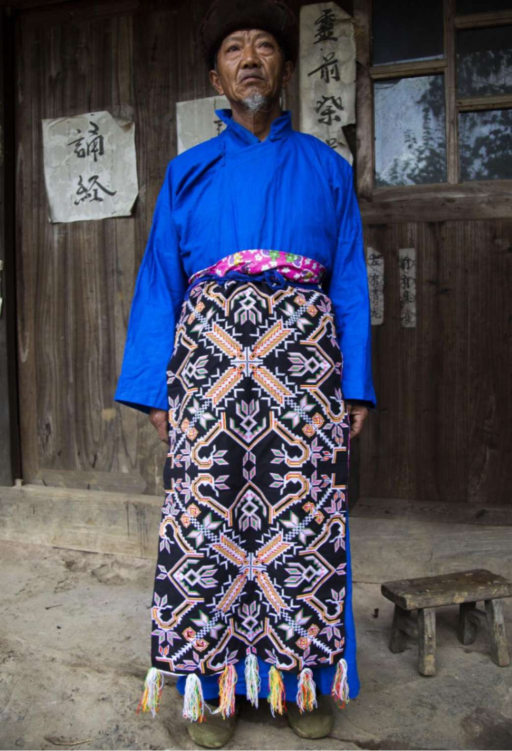 壩樓村苗族為花苗支,男子服飾比其他苗族支系的服飾更為艷麗,花紋圖案更多。男子服飾是一襲藍(lán)色的斜襟長(zhǎng)衫,但在斜襟長(zhǎng)衫腰部會(huì)系上長(zhǎng)至腳踝的圍腰,圍腰以黑色為底色,上繡花紋和箭狀圖案,顏色以黃色為主。在圍腰下擺,連綴有絲縷。