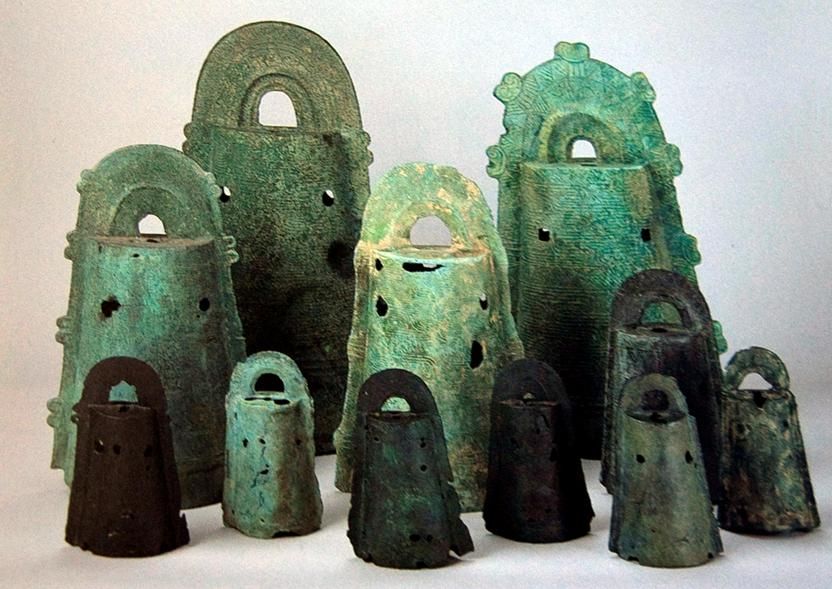 彌生時代也是機織布技術(shù)傳播,金屬器的使用和制造開始的時代。銅鐸,是日本本土生產(chǎn)的一種器型,為祈愿豐收時祭祀用的鳴鐘,常見于貴族墓葬中。使用的時候僅敲擊單獨一件,與中國成組配套使用的編鐘不同。