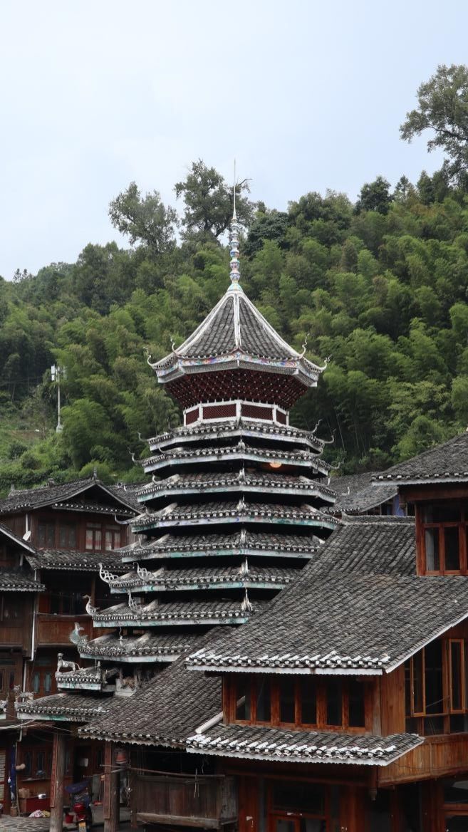 侗族認(rèn)為單數(shù)代表吉祥、好運(yùn),鼓樓層數(shù)均為單數(shù)。鼓樓以杉木為柱枋,鑿榫銜接,再加假柱,層層支撐而上,不用一釘一鉚。鼓樓是侗族議事、祭祀、娛樂休閑的場所。