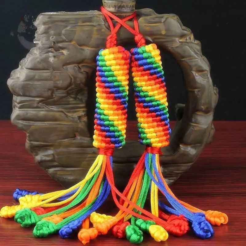 科爾沁繩編設(shè)計(jì)精巧,尤其擅長表現(xiàn)游牧民族生活之美, 具有地域民族風(fēng)情之美,繩結(jié)造型多為上下一致、左右對稱、正反相同、首尾銜接。一根彩繩通過綰、結(jié)、穿、纏、繞、編、抽等多種工藝技巧,按照章法循環(huán)有致、連綿不斷編制而成。近代由于蒙漢文化的融合,繩編技法也開始相通了。