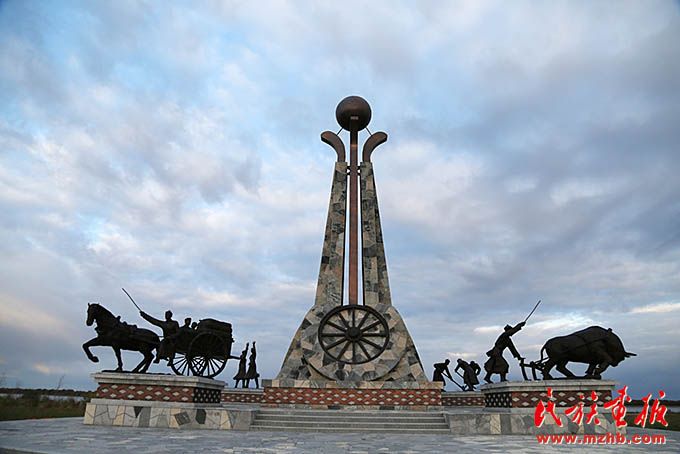黑河市愛(ài)輝區(qū)坤河達(dá)斡爾族滿族鄉(xiāng)富拉爾基達(dá)斡爾族南遷廣場(chǎng)上的雕塑反映了達(dá)斡爾族在黑龍江畔開墾土地,建設(shè)家園的情景。