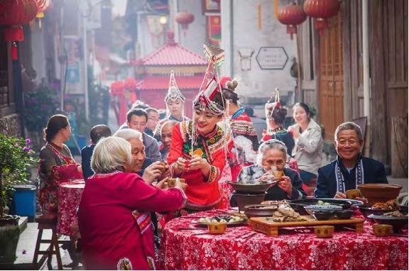 2.畬族婚嫁:婚禮的特色較多。迎親隊(duì)伍到村時(shí),嫁方村上女性拿杉木枝欄路,表示晚上要對(duì)歌;到中堂時(shí),嫁方請(qǐng)四位男子與迎親隊(duì)伍中四人相對(duì)作揖,此儀式叫“拾田螺”,表示歡迎;中餐由嫁方請(qǐng)迎親隊(duì)伍,媒人就坐中堂席首位,叫“落腳酒”;晚餐由娶方請(qǐng)嫁方親戚朋友,舅公就坐首席,叫請(qǐng)“大酒”;午后,赤郎舉行“借鍋”儀式,赤郎端點(diǎn)紅燭放有一刀肉和兩塊豆腐的米篩向灶神作揖后,用謎語(yǔ)念借所有的炊具,姑嫂們把能藏的炊具都藏起來(lái),念不到就不拿出來(lái),要全部重借,“借鍋”意為娶方借嫁方炊具宴請(qǐng)客人。借好之后,赤郎要?dú)⑷⒎郊姨魜?lái)的一只公雞用以嫁方“請(qǐng)祖公”,殺雞時(shí),規(guī)定血不許滴到地上,滴一滴地上罰一碗酒;宴席中途嫁方女歌手會(huì)起歌頭找赤郎對(duì)歌。畬族婚禮的又一個(gè)特點(diǎn)是,新娘夜行嫁,卯時(shí)進(jìn)夫家門(mén)。行嫁時(shí)有牛在前頭踏路,意為新娘一切都要新的,牛踏過(guò)的路為新路。以往嫁妝有鋤頭、斗笠、棕衣、線(xiàn)簍、火籠等,體現(xiàn)了畬族婦女熱愛(ài)勞動(dòng)。