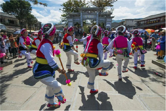在白族女子的包頭頭飾上,蘊(yùn)含著一個(gè)大家非常熟悉的詞語:風(fēng)花雪月。垂下的纓穗象征下關(guān)的風(fēng),艷麗的花飾象征上關(guān)的花,帽頂?shù)臐嵃资巧n山雪,彎彎的造型是洱海月,足見白族群眾的精巧靈思。