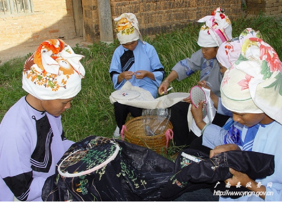 廣南刺繡歷史悠久,遍及壯鄉(xiāng)苗嶺,瑤山彝寨,街頭巷尾,處處都是刺繡的天地。壯族青年婦女的頭飾、圍腰心、圍腰頭、高綁布鞋要繡上圖案裝飾,兒童戴的貓頭帽、花風(fēng)帽、燕尾帽、月牙帽繡有花邊絲綢,帽前鑲有十八羅漢銀器像,帽的左右兩邊掛有兩串銀器以示吉祥,壯族婦女的外衣繡有三角形、四方形花紋圖案,廣南壯族人民使用的生活用品,如被套、枕巾、桌布、窗簾、手帕以及婦女背小孩的背帶、兒童披風(fēng)和靈芝鞋等都要繡上花鳥小草點綴,體現(xiàn)出美的情致。