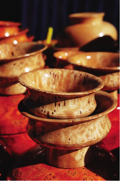 官員們使用的木碗,固然也非常注重外面的金銀寶石包裹,而木碗本身,也有一套非常固定的學(xué)問,盛開水不裂,摔到地上不會破,不燙手不冰手,體輕而質(zhì)固,經(jīng)久耐用,可以爺孫相傳。用這種碗盛食,可以完全保持食物原味,吃酥油糌粑等油肉類食品猶為適宜。比之于一般瓷碗,是碗中上品。這種木碗一般都是選用一些稀有雜木的節(jié)或者根雕琢而成,除了材料本身,在加工過程中的工序也十分重要,必須要加工出來一些獨(dú)特的花紋,比如磷火紋,或豬鬃紋,或貓頭鷹眼紋等,有這種花紋的碗,就要格外名貴,比如這次普布次仁兄弟所制作的大型核桃木碗,全身均勻地布滿了貓頭鷹眼紋,所以才能賣出這么高的價(jià)格。在西藏很多地區(qū),都流傳著這樣一個(gè)諺語:“一只上等木碗等于10頭牦牛?!?/p>