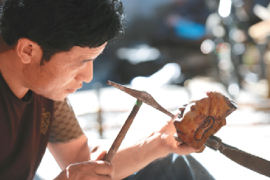 20歲前的次嘎已可以承接一些佛像的鍛敲任務(wù),掌握的技術(shù)遠(yuǎn)遠(yuǎn)超出一起學(xué)習(xí)的其他學(xué)徒們。從鍛敲佛像的蓮花底座、焊接,再到鍛敲銅佛造像上半身、下半身,再到慢慢地開(kāi)始做些佛像飾物。偶爾,次嘎也能涉獵造像的臉部。這是一個(gè)造像師手藝達(dá)到最好時(shí)才可以觸及的部位。“面部結(jié)構(gòu)復(fù)雜又微妙,面部表情的刻畫(huà)更是難上加難。作為一個(gè)造像師,這是最考驗(yàn)功力的地方,每一次敲打都在決定作品的成敗?!贝胃抡f(shuō)道。