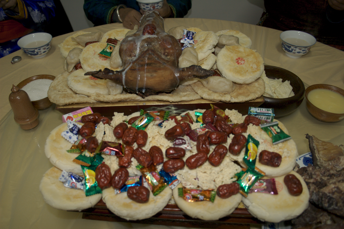 全羊席,又稱整羊席(蒙古語(yǔ)為“布禾勒”或“酥斯”),是蒙古人招待貴賓的傳統(tǒng)佳肴,也是蒙古民族最古老、最隆重的一道宴席,一般只在盛大宴會(huì)、隆重集會(huì)、舉行婚禮或接待高級(jí)貴賓時(shí)擺設(shè)。將整羊加工后擺在長(zhǎng)方形的大木盤(pán)里,像一只臥著的羊,肉味鮮美,香飄滿堂。賓客在進(jìn)餐前,還要舉行一定的儀式,高唱贊歌,朗誦獻(xiàn)整羊祝詞等。據(jù)文獻(xiàn)記載,成吉思汗曾設(shè)過(guò)全羊宴。忽必烈登基時(shí),也設(shè)全羊宴祭神祇、待賓客。至清代全羊宴更加盛行,現(xiàn)已成為蒙古民族風(fēng)格接待貴賓的名貴菜肴,馳名中外。