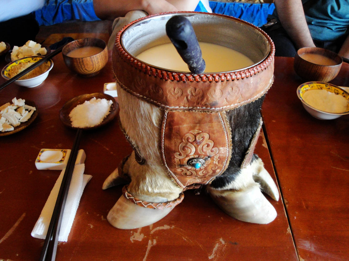 奶茶(蒙語(yǔ)叫“蘇臺(tái)柴”)是蒙古民族日常飲用的一種茶,也是蒙古人民招待客人的必備飲料。其做法,一般是將磚茶放入鍋內(nèi)熬成紫紅色,然后將鮮奶(除常用的牛奶外,還用羊奶或駝奶)大致以六比一的比例放入茶水中熬開(kāi),即成。隨其所好,可加鹽或加糖。奶茶營(yíng)養(yǎng)豐富,具有提神、開(kāi)胃、助消化、解渴等功效。