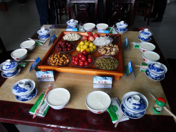 回族普遍喜歡飲茶。回族先民喜食甜品,在中國茶文化影響下,形成了以甜味為特色的飲茶習慣。飲茶之風興起于中國晉代,盛于唐代以后,隨之出現(xiàn)了茶具,其中以包括茶托、茶碗、碗蓋的“三坯胎”蓋碗美觀實用?;刈謇^承發(fā)展了這種茶文化,形成了以“三炮臺”為茶具的“八寶蓋碗茶”:在茶具中放入茶葉(茉莉花茶、陜青茶、紅磚茶、窩窩茶、毛尖等)、糖(白糖、紅糖、冰糖、梨膏糖等)及紅棗、核桃仁、桂圓肉、芝麻、葡萄干、枸杞(或柿餅、山楂、姜片、果干)等配料,用開水沖制后飲用。茶葉及配料在不同的地區(qū)、不同的季節(jié),根據(jù)飲茶者的身體狀況與喜好有不同的搭配,如“紅糖磚茶”“冰糖陜青茶”“三香茶”(茶葉、糖、桂圓)、“白四品”(陜青茶、白糖、柿餅、紅棗)、“紅四品”(磚茶、紅糖、紅棗、果干)、“五味茶”(綠茶、山楂、芝麻、姜片)等。八寶茶具有生津解渴、開胃健脾的作用,放入不同的茶料,又具備了不同的健身康體功能。