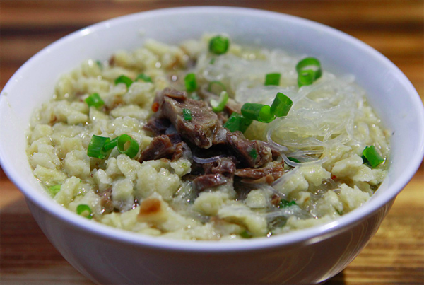 饃掰好后,請伙計呈給掌勺大廚,加羊肉湯大火快煮,加牛羊肉、粉絲、蔥花、蒜苗、香菜,優(yōu)質(zhì)的還有木耳、黃花菜和香干等即可端上來吃了。這樣一大碗自己親手掰好的泡饃,翠綠的蔥花、蒜苗、香菜、紅褐色的牛羊肉、黃色的金針菜、映襯著潔白晶瑩的粉絲、黝黑的木耳、香味四溢,。還應(yīng)注意的是:端上來的泡饃應(yīng)是泡饃墊底,粉絲覆成網(wǎng)形,佐以蔥花、香菜、牛羊肉擺成魚形在最上面,吃時左手拿勺,右手執(zhí)筷。泡饃上桌后,把辣子醬鋪在上面,切忌攪動,講究從一邊“蠶食”,以保持鮮味。糖蒜用否,個人自愿。餐后飲用一小碗原汁烹制而成的高湯,以為清口。