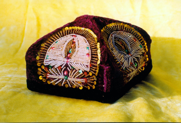 此外,維吾爾族花帽更是具有濃重的維吾爾特色,男女均可佩戴。古代人們佩戴花帽主要用于抵御風寒,現(xiàn)代維吾爾人佩戴各類花帽則主要起到裝飾作用。維吾爾花帽造型多樣,其圖案花紋也各有不同,主要有以下幾類:巴旦姆花帽、塔什干花帽、格來木花帽、曼波爾花帽、奇曼花帽、再爾花帽、瑪日江朵帕、金片花帽、吐魯番花帽、伊犁花帽、夏帕克帽、賽里甫西吐瑪克。