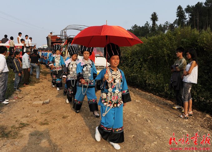 苗族送親隊(duì)伍來到新郎家的寨口,寨老為新娘主持“回喜神”儀式。楊昌垠,引自民族畫報