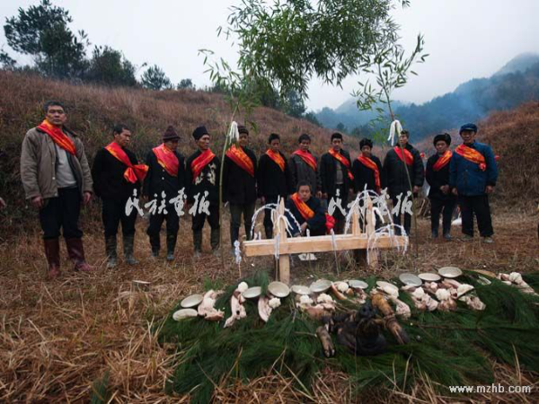 招完白虎龍后,天已大亮,這時村里人抬著一頭豬上來了,村民把龍橋龍凳做好,安放在壩子中央。接下來,儀式進入招龍程序。在龍橋龍凳的前方,擺上煮熟的豬頭、豬尾、豬腳和心肝、12坨豬肉、12碗甜酒、12碗糯米飯等祭品。12位招龍代表整整齊齊地站在龍橋龍凳的后方,燒完香紙后,由師傅開念招龍詞,把四面八方的大河小溪、大坡小坡、大嶺小嶺、大梁小梁、大橋小路、寨邊古樹的龍魂全喊到招龍場地來。傳說龍是治水的,苗族人崇拜龍,把龍招進來是為了保佑全村男女老少百年長壽,家家戶戶發(fā)子發(fā)孫,解災脫難,風調(diào)雨順,五谷豐登,喂牛牛大,養(yǎng)豬豬肥,養(yǎng)雞雞發(fā),順順利利,平平安安。師傅念完后,與招龍代表把12杯酒喝完,表示程序完畢。不久,全村男女老少三三兩兩都來到了山上,許多婦女帶著祭品燒香燒紙求子求孫,龍橋龍凳四周擠滿了人,香火彌漫整個山坡。