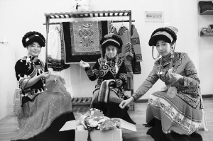 喬進雙梅(左一)和當?shù)氐囊妥謇C娘們一起交流刺繡技藝。