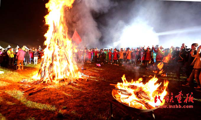 來(lái)觀看火把節(jié)的觀眾密密麻麻坐滿火把場(chǎng)周圍的山坡,場(chǎng)面十分壯觀