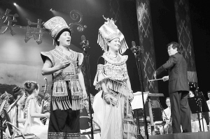 廣西戲劇院成立一年來,承擔(dān)起壯劇、桂劇、彩調(diào)劇3個國家級非物質(zhì)文化遺產(chǎn)劇目和京劇國粹藝術(shù)的傳承、保護(hù)、發(fā)展重任,不斷推出具有“美麗廣西、壯鄉(xiāng)風(fēng)格、時代特征、和諧兼容”的舞臺藝術(shù)精品,此次推出的《壯族詩情》便是其中之一?!秹炎逶娗椤饭卜帧暗毓摹?、“天歌”、“水秀”、“山雄”4個章節(jié),以150多名演職員的演出陣容,通過合唱、獨唱以及民族器樂演奏的形式,如詩如畫地描述了廣西壯族的風(fēng)土人情,突出了“美麗廣西”時代主旋律。圖為《壯族詩情》演出現(xiàn)場。