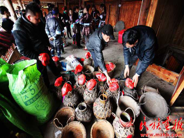 侗族婚俗中還有“買美打油茶”的習(xí)俗?!百I美”是音譯詞,是新娘的意思。在舉行婚禮的當(dāng)天,新娘要打油茶,故而有這么一說。另外,新娘在進(jìn)入夫家的火塘屋前,要通“兩關(guān)”:跨扁擔(dān)與穿草鞋。嫁入夫家的第二天還有“挑金水”的習(xí)俗。