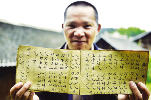 圖為仁吉侗寨村民吳昌賢在展示祖輩流傳下來的古老蘆笙曲譜。 吳國楨 攝影報道