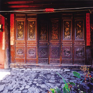 云南大理市綠桃村“三坊一照壁”民居堂屋六扇木門的雕刻。院內(nèi)廈廊和正房的格子門,一般由6扇組成,每扇門又分隔成5塊木板,每塊木板都是透雕和浮雕相結(jié)合的木雕。分別雕刻著“雙鳳朝陽(yáng)、二龍搶寶、八仙過(guò)海、喜鵲登梅、漁樵耕讀、六合同春”的吉祥圖案,刀法嫻熟,輪廓清晰,形象生動(dòng),一個(gè)院落就是一個(gè)木雕藝術(shù)畫(huà)廊。此外,窗上有通透的花格,下部檻墻做成木質(zhì)裙板。