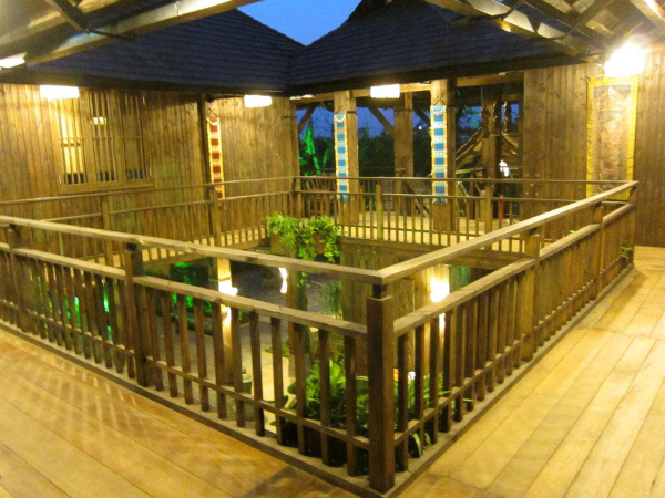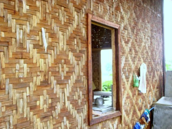 上層近梯處有一露臺(tái),轉(zhuǎn)進(jìn)為長(zhǎng)形大房,用竹籬隔出主人臥室并兼重要錢物存儲(chǔ)處。其余為一大敞間,屋頂不甚高,兩邊傾斜,屋檐及于樓板,一般無窗。若屋檐稍高則兩側(cè)開有小窗,后面開一門。樓中央是一個(gè)火塘,日夜燃燒不熄。屋頂用茅草鋪蓋,梁柱門窗樓板全部用竹制成。