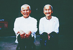 當(dāng)我來(lái)到時(shí),老人已經(jīng)入殮。我借機(jī)打量傣家這從不許外人參觀的、全家?guī)状硕妓诶镞叺纳衩氐呐P室。只見(jiàn)臥室是一個(gè)通廊,里邊一長(zhǎng)溜的帕墊(傣家人用來(lái)睡覺(jué)的棉被)都收裹起來(lái),棺材就橫放在臥室的中央,一個(gè)用竹子編成喇叭形狀的燈架里有一盞燃著的油燈;棺材的上面橫拉著一根筷子粗的尼龍繩,上面掛著一些筒裙衣物,想來(lái)可能是死者的;幾個(gè)男性老人圍著棺木而坐,往棺木上剪貼著白、綠、紫、黃幾種顏色的紙花。隨后而來(lái)的巖化告訴我說(shuō):“過(guò)世的老人已有82歲了。她生前為人隨和,很受寨子里晚輩的敬重。死前已臥床一個(gè)多星期,不吃不喝,也無(wú)疼痛跡象,正所謂天年已盡,壽終正寢?!睅r化還向我介紹說(shuō):按傣族的習(xí)慣,死者一咽氣,親友便立即用溫水為死者洗澡、梳頭、洗臉(洗臉時(shí),由下向上,以示區(qū)別于活人),穿上新的衣、褲、襪、鞋,包新頭帕。還要在死者嘴里放入一小砣金或銀,稱作含口錢(qián)。然后用白布裹尸,將死者雙掌合十,放進(jìn)棺材里,用一塊方帕蓋臉。最后蓋上棺材,并通知寨子里的人。