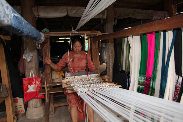 傣錦具有嚴(yán)格的制作工序。第一道工序?yàn)樯蠞{。傣錦所選用的材料為天然麻棉,上漿可以讓麻棉線的韌性加強(qiáng),不會(huì)起毛,這一步對(duì)以后織傣錦的過程有非常重要的影響。先將麻棉用專門調(diào)制好的米漿浸泡一天兩夜,再放到蒸籠蒸,蒸的時(shí)侯要注意不斷小心地翻動(dòng),以保證米漿完全均勻地浸入棉紗,令到棉線的粗細(xì)一致。第二步是曬棉紗。即把蒸好的棉紗放在太陽(yáng)底下暴曬,在曬的過程中需要由專人隨時(shí)檢查,把結(jié)在一起的棉紗一根根分開來,這樣在紡線的時(shí)侯棉線才不會(huì)因?yàn)榫€粘在一起而斷掉。最后把曬好的線繞成線團(tuán)。第三步是拉經(jīng)線。拉經(jīng)線也是傣族織錦中非常重要的一道工序。在拉線的時(shí)候,所需要的場(chǎng)地非常大,因?yàn)榫€一拉一般都有八九十米長(zhǎng),為保持所有的線在拉的時(shí)候不會(huì)亂掉,只能在沒有太大的風(fēng)的天氣才能進(jìn)行,讓整個(gè)傣錦制作過程又增加了難度。在拉經(jīng)線的整個(gè)過程,都必須由有經(jīng)驗(yàn)的老藝人來組織,打樁,計(jì)算經(jīng)線的長(zhǎng)度,而且必須控制好在拉經(jīng)線的過程中棉線的松緊度。否則在織傣錦的時(shí)侯會(huì)有花紋傾斜,圖案錯(cuò)亂等問題。整個(gè)拉經(jīng)線的過程需要由7-8個(gè)老藝人一起來完成。第四步是編花和上機(jī)。傣錦是一種古老的手工紡織工藝,圖案的設(shè)計(jì)是通過熟練的紡織技巧創(chuàng)造出來的,多是單色面,用緯線起花,對(duì)花紋的組織非常嚴(yán)謹(jǐn),織造時(shí)傣族婦女將花紋用一根根細(xì)繩系在“紋板”(花木)上,用腳蹬手抬的動(dòng)作使經(jīng)緯形成上下兩層后開始投緯,如此反復(fù)循環(huán)便可織成十分漂亮的傣錦。設(shè)計(jì)一幅傣錦,需幾百乃至上千根細(xì)繩在“紋板”上表現(xiàn)出來,倘若結(jié)錯(cuò)一根細(xì)線,就會(huì)使整幅傣錦圖案錯(cuò)亂,可見傣錦的工藝要求極高。