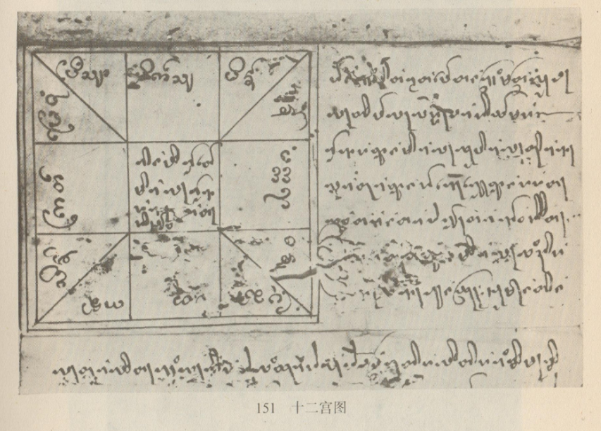 傣哪文天文著作中保存的傣繃文黃道十二宮圖。圖分13格,周圍12格寫傣繃文十二宮名,以上中格為起點,往左其順序為白羊?qū)m、金牛宮、雙子宮、巨蟹宮、獅子宮、室女宮、天秤宮、天蝎宮,人馬宮、摩羯宮,至雙魚宮與白羊?qū)m銜接。中格及圖外說明皆傣哪文。為罕見的兩種傣文合壁的天文學資料。原件存民族文化宮。
