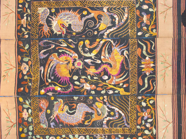 從龍被的圖案中,我們可以辨別出它是屬于哪個年代的作品。早期的圖案多為人形紋和鬼紋(人的靈魂),這兩種圖案實際上都是一樣的,是由色彩的明暗來區(qū)分的,明的是人形紋,暗的是鬼紋。后來的龍被,因受漢族文化的影響,圖案也逐漸漢化了。因此,后期的龍被,織物和部分圖案保留黎族文化,而刺繡的花紋圖案都是漢文化的。