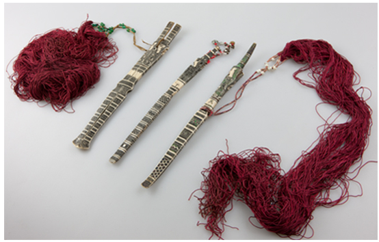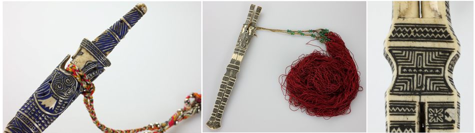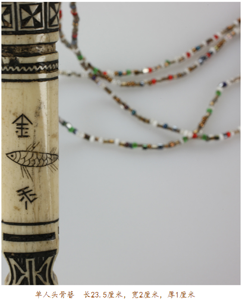 骨簪頭部以下是充滿幾何感的水波紋、山形紋、米字紋、圓形紋,留白之處有魚(yú)紋、花紋以及少許文字。文字或是雕刻者本人,或是其心愛(ài)之人。一般頭像處或中部系有幾束彩色料珠的紅纓穗飾物用以盤(pán)繞發(fā)髻上,或是以銀鈴、銀片來(lái)裝飾。