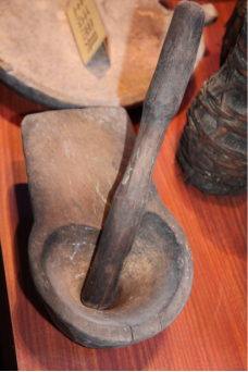 佤族以大米為主食。西盟地區(qū)的佤族都喜歡把菜、鹽、米一鍋煮成較稠的爛飯。其他地區(qū)的佤族則多吃干飯。農(nóng)忙時(shí)日食三餐,平時(shí)吃二餐。雞肉粥如茶花稀飯是家常食品的上品。旱稻多現(xiàn)吃現(xiàn)舂,男女老幼皆食辣椒,民間有“無辣子吃不飽”之說。副食是青菜類、瓜類、酸竹筍、鹽、辣椒、蔥、蒜等。肉食主要是牛、豬、雞、狗以及獵獲的獸、禽、松鼠、田鼠、魚、螺螄、螃蟹、蜂兒等。一些地區(qū)的佤族還有捕食昆蟲的習(xí)慣,更食用蛹、寄生于草木植物的紅毛蟲、掃把蟲和寄生于冬瓜樹的冬瓜蟲等十余種。一般是把可食的昆蟲與米一起煮成粥,加菜、鹽、拌辣椒,香辣可口(兩圖為舂米和舂米用具,劉軍攝影)。