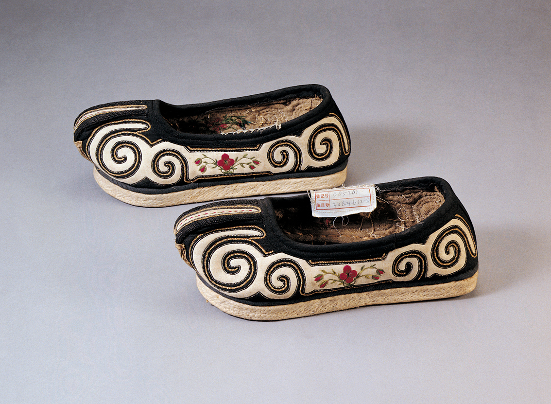 土族民國時期云紋雙梁繡花男布鞋,中央民族大學民族博物館館藏