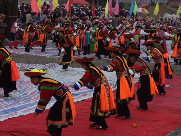 不同地區(qū)的土族舞蹈具有相對(duì)獨(dú)立性,互助的“安昭”、民和的“納頓”、大通的“踏灰”、同仁的“於菟”、甘肅卓尼的“嘎?tīng)枴钡仁亲罹叽淼拿耖g舞蹈?!鞍舱选保琳Z(yǔ)稱之為“千佼日”,意為“彎曲”或“轉(zhuǎn)圈”,是土族民間喜慶節(jié)日和婚禮儀式中,用于禮贊祈祝的一種圓場(chǎng)群舞,也是一種歌舞結(jié)合、無(wú)樂(lè)器伴奏的集體舞蹈。一般由男女各半圍成圓圈,由一男子帶領(lǐng),一唱眾和。舞蹈動(dòng)作簡(jiǎn)單質(zhì)樸,舞者兩手由右胯旁起向左上方至右上方劃圓弧,變?yōu)樽笫智谀X前,右手高居于后,似雄鷹翱翔于藍(lán)天。“於菟”舞即虎舞。“於菟”,是古代楚人對(duì)虎的方言稱謂。每年農(nóng)歷十一月二十日祭山神時(shí),名為於菟的舞者在赤裸的上身繪制虎豹圖案,模仿虎的形象“前端腿跳”舞蹈,達(dá)到祀神驅(qū)邪、祈求平安的目的。