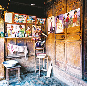 隴川縣戶撒鄉(xiāng)曼旦寨是阿昌族古老的村寨之一,明、清時期的老宅皆以楠木建造,數(shù)百年不朽、無蟲蛀。受漢族文化影響,傳統(tǒng)民居大都是土木石結(jié)構(gòu)的三合一照壁或四合院落。正房建在長方石條加土方壘起的屋基上,屋基下為院壩,以三層石階上下。正房三開間,四排五柱,中柱起脊,形成雙斜面屋頂,上覆凹型青瓦。后墻和兩側(cè)山墻以土坯砌筑,外面不抹泥,左右是廂房或照壁。室內(nèi)隔墻均為木板,中間一間為堂屋,有一米多寬的吞口,六扇雕刻的木板門,平時只開中間兩扇。兩邊的檐柱頭有粗獷的木雕。吞口有走廊的作用,一般左側(cè)角設(shè)臉盆架以供洗漱,板壁上掛小鏡框以便梳妝,旁邊掛著家人的照片。有的擺著縫紉機,有的放藤椅小憩。右側(cè)放臨時的農(nóng)具,掛衣服,板壁上貼著影視明星的招貼畫。堂屋正面板壁是通高的木雕佛龕,供奉佛像和傣文的經(jīng)文,龕楣上貼著三至四層掛錢,下面有燭臺、香爐。左側(cè)擺著電視機、熱水瓶、茶桌,板壁上掛著戶撒刀和手工編織的背兜,右側(cè)有專供老人休息的床或藤椅,也有的砌火塘,火塘的小土臺上放著炒菜的調(diào)料、火柴和照明燈具。