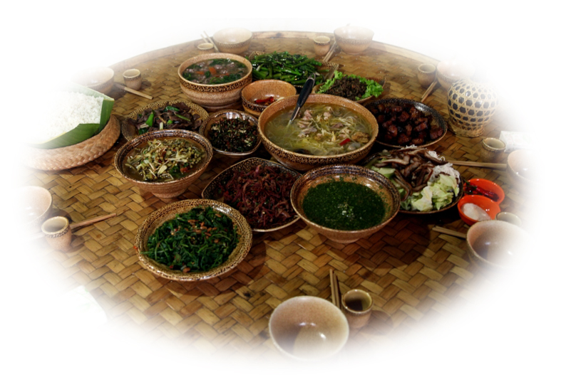 德昂族絕大多數(shù)以大米為主食,部分地區(qū)雜以包谷和薯類。均以蒸燜而食,擅長(zhǎng)制作各種糧食制品,如:豌豆粉、豆腐、米粉、年糕、粑粑、湯圓等。蔬菜種類繁多,竹筍是四季不斷的蔬菜之一,除鮮吃外,多加工成酸筍或干筍食用。其他蔬菜的食用,都習(xí)慣于在煮燉時(shí)配酸筍,或加油、豆豉、鹽成雜熬菜。酸筍用途十分廣泛,即使在燉雞、炒肉或烹魚(yú)時(shí)都要加酸筍調(diào)味。受當(dāng)?shù)貪h族的影響,許多漢族風(fēng)味的腌菜、腐鹵也是德昂族餐桌上常見(jiàn)的小菜。德昂族民間制陶和使用竹編制品歷史悠久,所有炊餐用具,大都是自制的陶器和竹器。