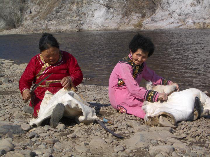 鄂倫春人過去在家庭公社“烏力鄰”里,同生產(chǎn)共消費,在當(dāng)時生產(chǎn)力十分低下的情況下,憑著扎槍和弓箭,單個人很難獲得能夠滿足衣食需要的獵物,必須要有“烏力鄰”全體成員的通力合作,才能戰(zhàn)勝兇猛和龐大的野獸,所以,在“塔坦達”領(lǐng)導(dǎo)下的集體狩獵是當(dāng)時最主要的勞動形式。隨著生產(chǎn)力的不斷發(fā)展和個體小家庭的大量流動,不僅社會組織“烏力鄰”由原來血緣性的家庭公社演變?yōu)榈鼐壭缘牡赜蚬?,勞動組織也隨之發(fā)生了極大的變化。集體狩獵已不再是“烏力鄰”傾巢出動,而是由幾個小家庭的成員自愿結(jié)合成“安嘎”來進行。同時還出現(xiàn)了集體和個人等多種勞動形式。狩獵也不再單純是為了滿足衣食的需要,剩余獵物可以拿去交換,獵產(chǎn)品已趨于商品化。故此時一些珍貴的細毛皮張和藥用價值較高的獸類,成了鄂倫春人主要的狩獵目標。這樣就形成了一年中的四個狩獵旺季,即:農(nóng)歷正月至2月是“鹿胎期”;4月至6月是“鹿茸期”;9月至落雪為“叫鹿尾期”;落雪后至來年開春是“打皮子期”。大概是源于原始的圍獵,鄂倫春人把狩獵叫“打圍”,而這四個狩獵旺季就叫“紅圍期”?!凹t圍期”除“叫鹿尾期”外,都組織“安嘎”集體出獵。“安嘎”是一種臨時性的狩獵組織,狩獵旺季將臨時,由一人發(fā)起,串聯(lián)幾位親朋好友或志趣相投的人組成一個“安嘎”,待獵期結(jié)束,“安嘎”自行解散,下次出獵時再重新組合,因此其成員并不是固定的(圖為熟化狍皮,吳雅芝攝影)。