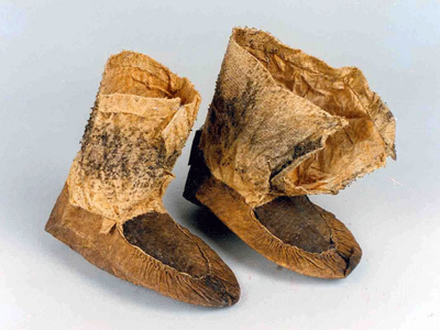 魚(yú)皮靴俗稱魚(yú)皮靰鞡,由魚(yú)皮四周整體向上折起,抽褶向上形成底部,前面與鞋臉縫制在一起,形成半圓形,鞋口再用另一塊魚(yú)皮縫上,形成圓筒形靴靿,然后穿繩或皮條做鞋帶。此鞋由身、臉、黝三部分組成。魚(yú)皮鞋既結(jié)實(shí)保暖,又抗寒防水防滑,適于在冰上和泥濘道路上行走及從事漁獵生產(chǎn)。如圖所示。