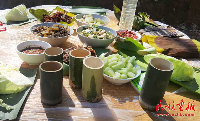 基諾族地區(qū)食材豐富,一日三餐,以大米為日常主食,雜以玉米、瓜豆等。每年5—9月的雨季,基諾山漫山遍野是食材,山藥、水芹菜、竹筍、魚腥草及各種菌類等無污染且很新鮮,是難得的烹飪材料,經(jīng)過簡(jiǎn)單處理就成為餐桌上的美味佳肴。基諾族民間有句俗話,叫“漢炒、傣蘸、基諾舂”,也就是說漢族人喜歡吃炒菜,傣族的菜喜歡蘸著調(diào)料吃,基諾族的菜則以臼舂為主?;Z族的肉類的吃法較多,可以腌成干巴,也可吃新鮮的。酸腌魚、涼拌茶也是基諾族的最愛,基諾人做飯就餐均在竹樓二層的火塘周圍進(jìn)行,有一定的禮節(jié)和講究?;Z族吃飯時(shí),主人首先要在火塘東側(cè)獻(xiàn)一點(diǎn)飯菜祭祀祖先和灶神,吃飯時(shí)全家人按順序在火塘旁圍蔑桌而坐,家長(zhǎng)正對(duì)火塘,客人靠火塘而坐。